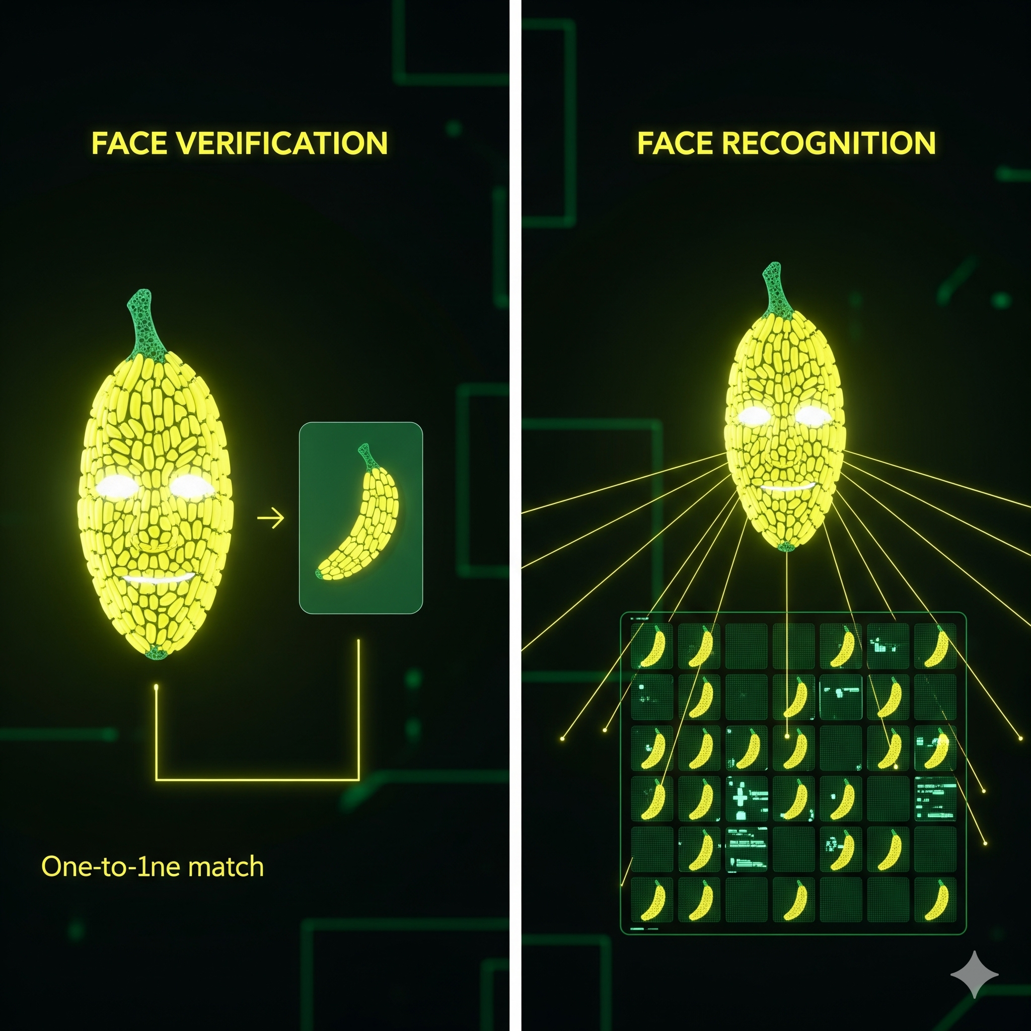 Think of a Border Control officer at the airport. You hand them your passport (the "claimed identity"). They look at the photo in the passport, then they look at your face. They are comparing Image A (you right now) against Image B (the file on record). They aren't looking through a book of every criminal in the world; they are just checking if A == B.