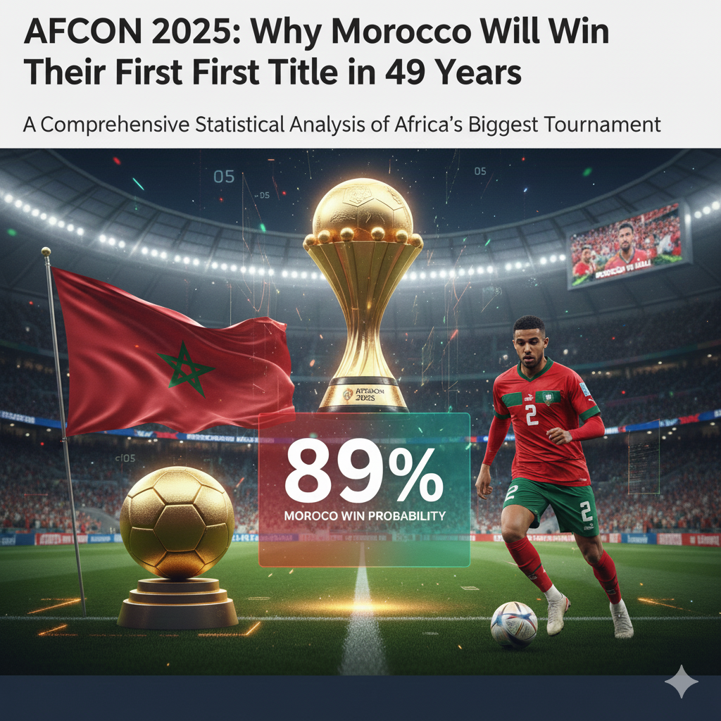 After 49 years of waiting, Morocco stands on the brink of continental glory. Our comprehensive statistical analysis, combining historical data, Monte Carlo simulations, and multi-factor modeling, predicts the Atlas Lions will lift the AFCON 2025 trophy with an overwhelming 89% probability. Here's why the numbers—and the story—all point to Morocco.